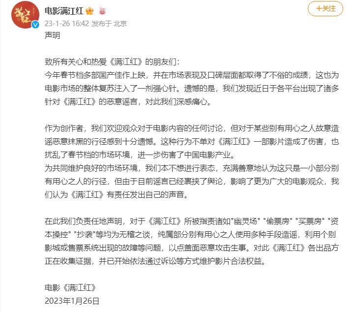 满江红发声明:偷票房等指责纯属造谣(满江红回应传言)